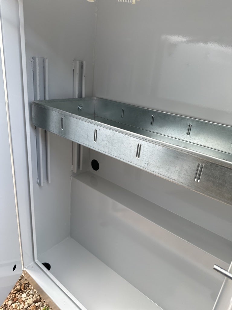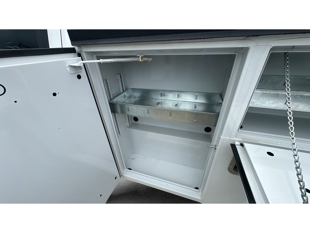 Reading RS Texas Edition Service Body equipped with 49" headache rack, bedliner, top covers and tailgate bedliner with rear hitch, 8" straight treadplate bumper, 3 compartments per side, 14.5" deep compartments, standard shelving and dividers, 49" wide floor, backup camera